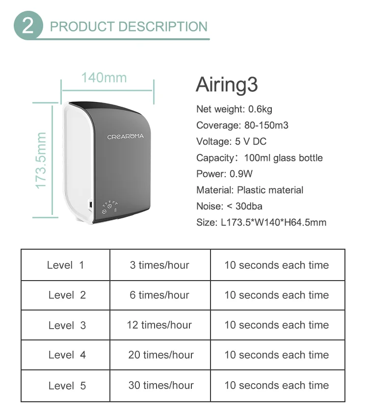 Airing3 เป็นตัวกระจายพลังงานแบตเตอรี่แบบชาร์จไฟได้พร้อมขวด 100 มล. เหมาะสำหรับพื้นที่ขนาดเล็กโดยเฉพาะสถานที่ที่ไม่มีไฟฟ้าเช่นลิฟต์ห้องน้ำและสถานที่อื่น ๆ ก็โอเค